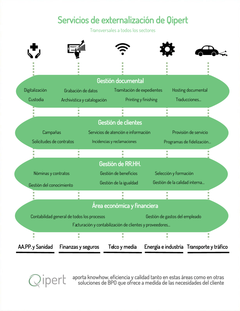 Los servicios de externalización de Qipert, transversales a todos los sectores, se centran en cuatro áreas: la gestión documental, la de clientes, la de recursos humanos y la correspondiente al área económica y financiera.